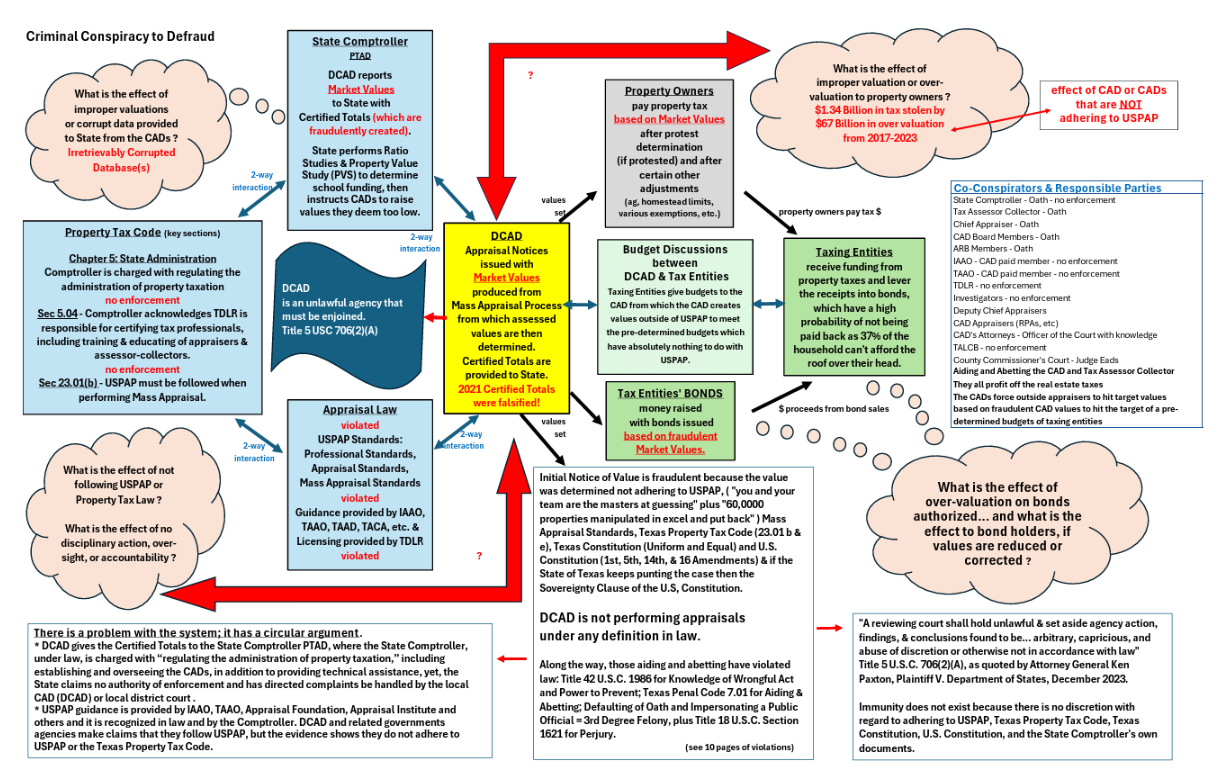 Below is the map of the criminal conspiracy which is currently being protected by the belief that the process stops at the ARB (Appraisal Review Board) which in law it cannot, as the ARB does not have the authority under law to detect fraud, or the knowledge to detect fraud or any knowledge about Uniform Standards of Professional Appraisal Practice. Ultra Vires and Sovereign Immunity cannot in law protect against fraud, otherwise for what purpose do they exist?