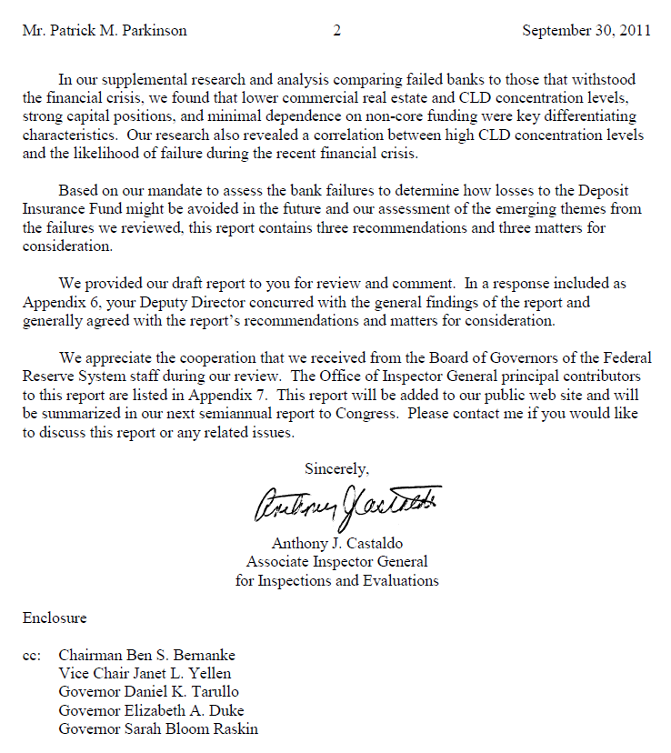 Below is the September 30th letter from Associate Inspector General Castaldo outlining the cause of the bank failures.